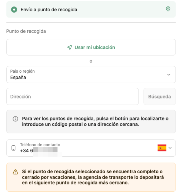 * Nota: Si el punto de recogida seleccionado se encuentra completo o cerrado por vacaciones, la agencia de transporte lo depositará en el siguiente punto de recogida más cercano.