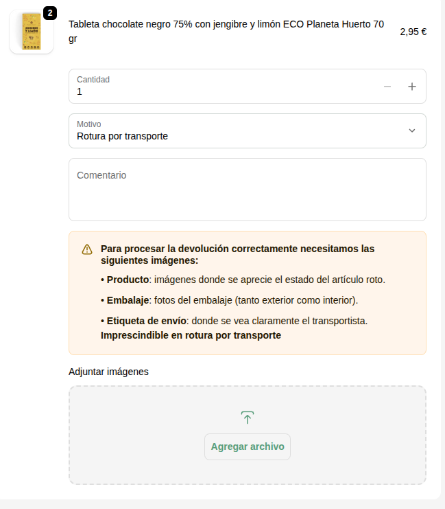 Selecione o motivo e adicione qualquer comentário que considere relevante sobre o estado da embalagem.