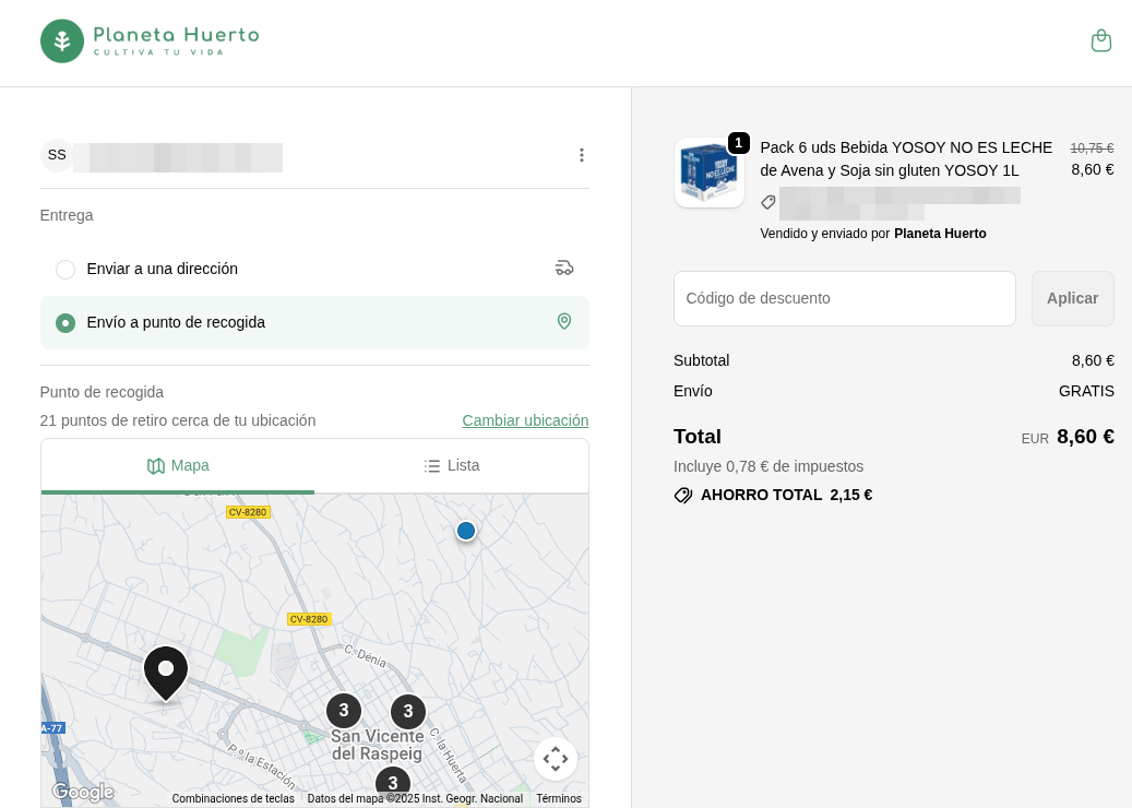 Esta opción te aparece durante el proceso de compra (en el caso de que no te salga, es porque es algún producto que no cumple los requisitos para ser recogido en nuestras instalaciones), deberás pinchar en "Enviar a punto de recogida", y añadir nuestro Código Postal, 03690.